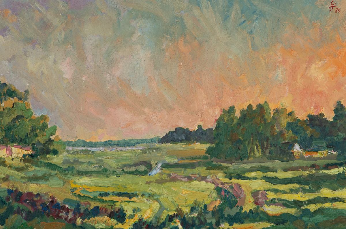 - Gerhard Stengel, Sommer am Ahrenshooper Bodden, 1985, Öl auf Hartfaserplatte, 44,5 x 66,5 cm
