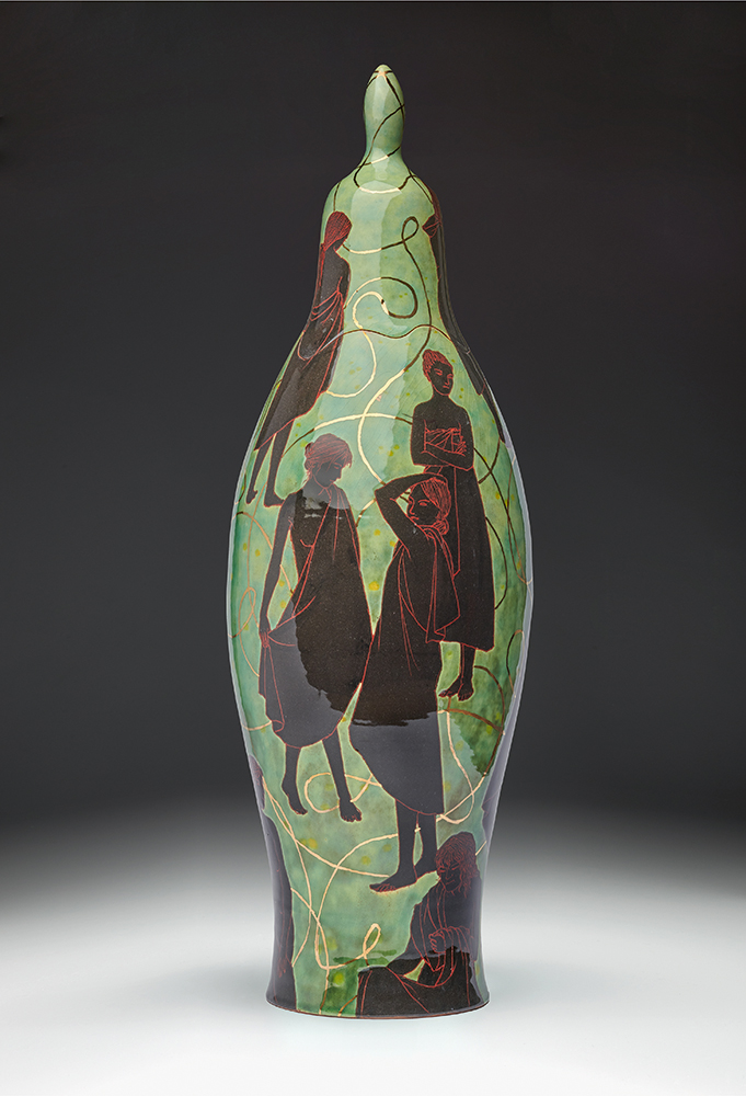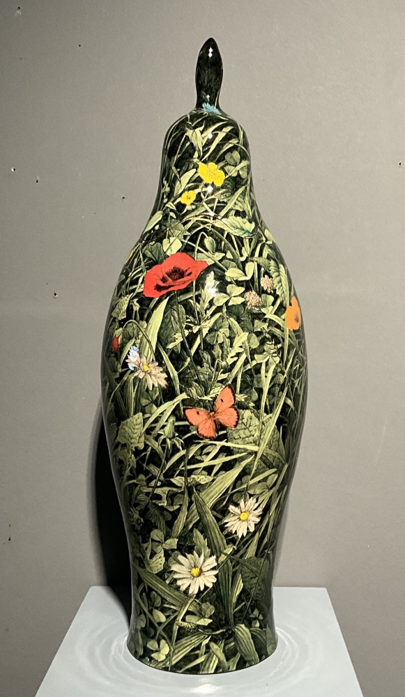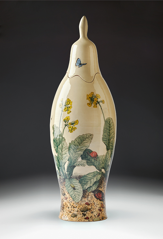 - Grita Götze, „Frühlingserwachen“, Deckelvase, 2024, Keramik, Engobemalerei, h = 49 cm