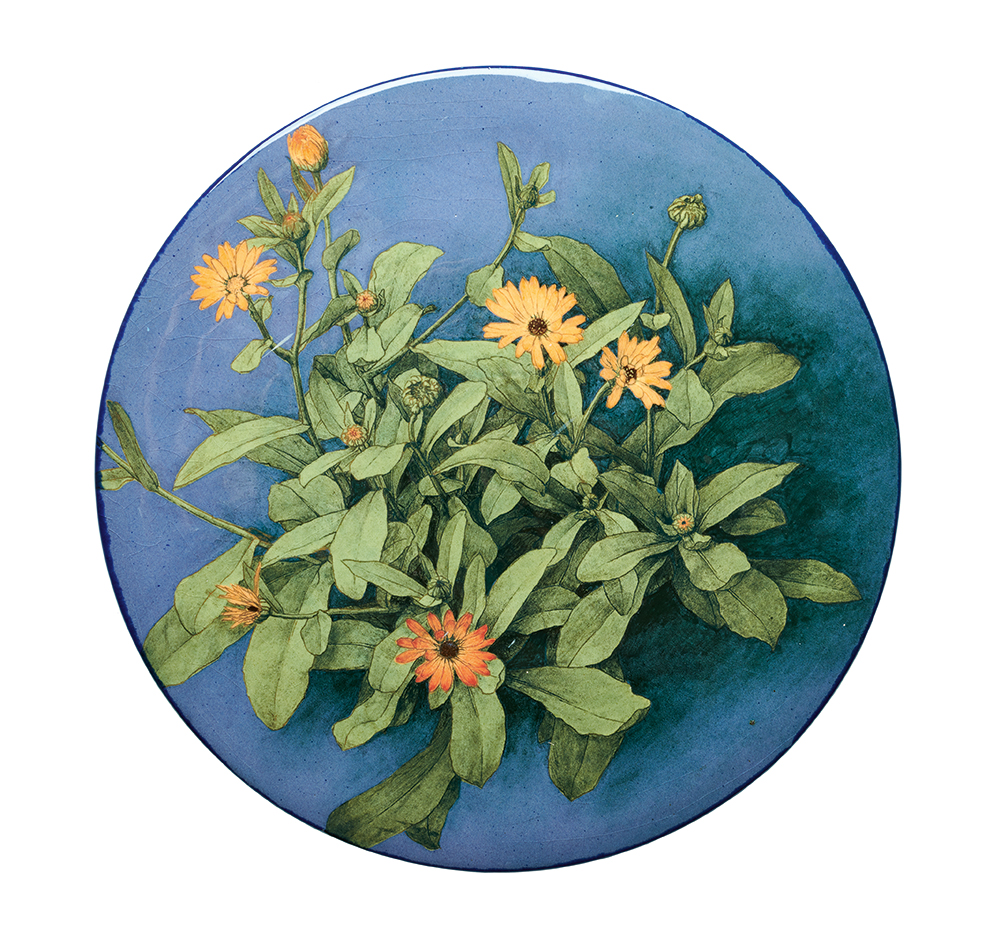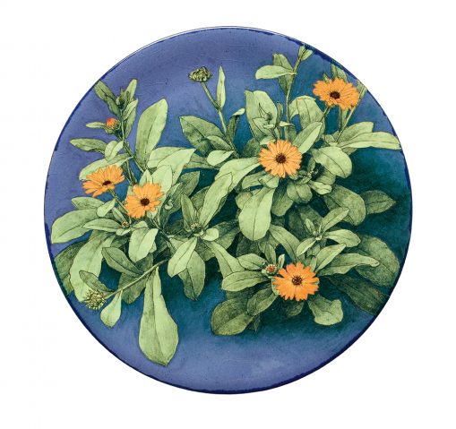 - Grita Götze, „Ringelblume“, Teller, 2025, Keramik, Engobemalerei, Ø 32,5 cm