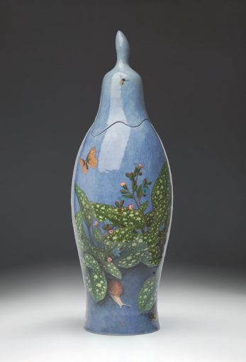 - Grita Götze, „Am See“, Deckelvase, 2023, Keramik, Engobe- und Goldmalerei, h = 51 cm