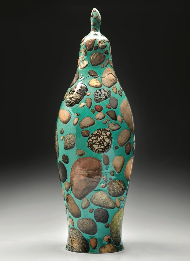 - Grita Götze, „Steine auf Türkisgrün“, Deckelvase, 2021, Keramik, Engobemalerei, h = 51 cm