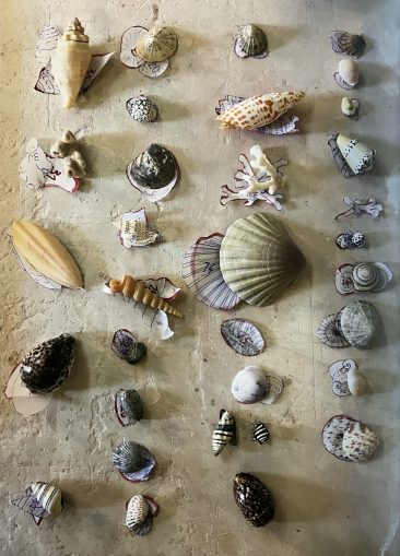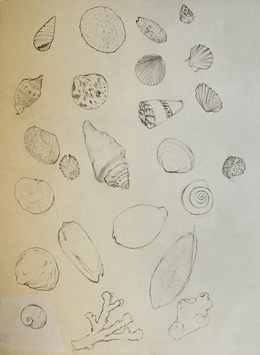 Bleistiftzeichnung der verwendeten Muscheln und Schnecken