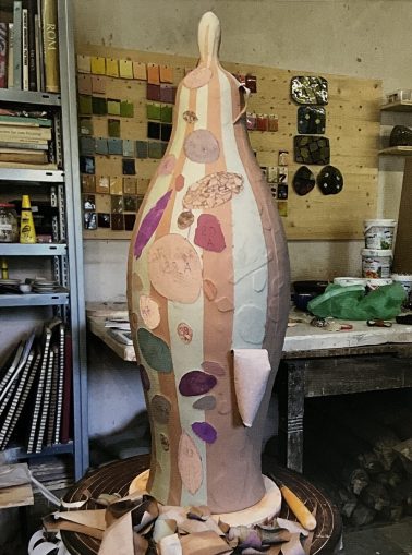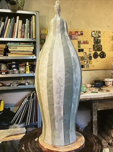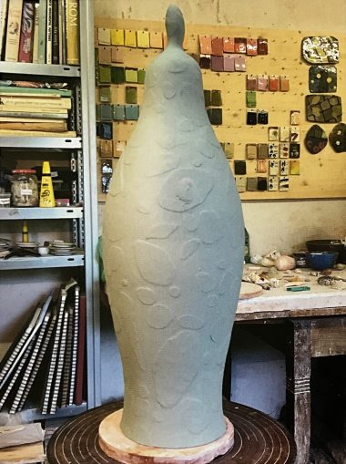 Nachdem alle Motive mit Papieren abgedeckt sind, wird die Deckelvase vollständig mit türkisgrüner Engobe übergossen.