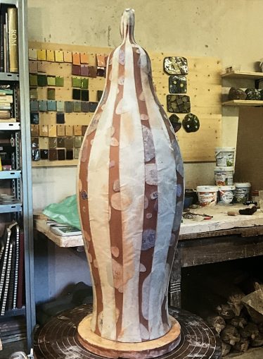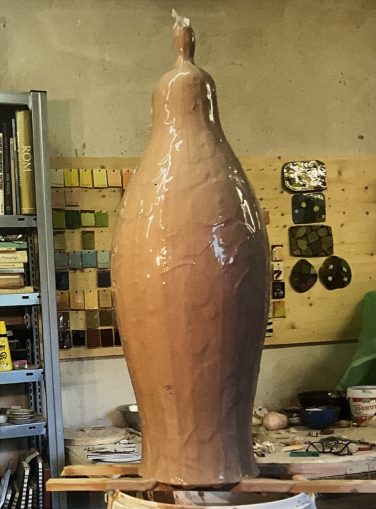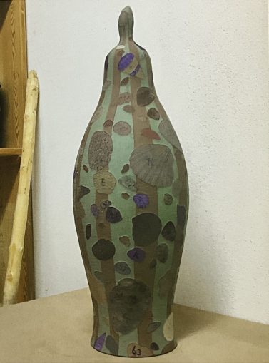 Die Deckelvase wird nun mit der letzten Farbe, einer olivbraunen Engobe, übergossen. Jetzt ist die gesamte Oberfläche mit farbigen Engoben bedeckt.