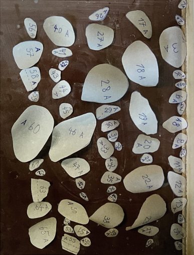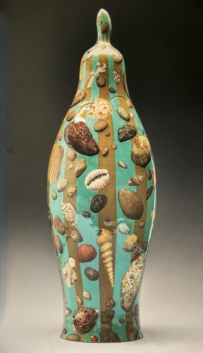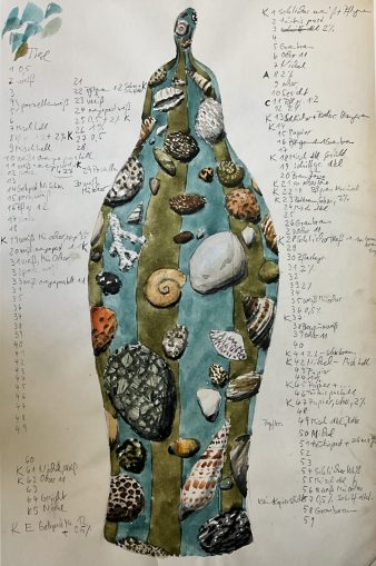 Aquarellentwurf zur Deckelvase Stillleben mit Steinen und Mollusken. Da die Farbigkeit nach der Papierabdeckung nicht mehr erkennbar ist, habe ich zu den nummerierten Motiven entsprechende Anmerkungen gemacht.