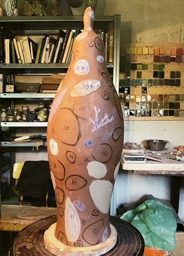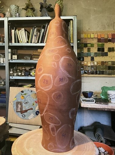 In diesem Stadium kann ich mit der Radiernadel die Linienzeichnung vornehmen, Strukturen einarbeiten, Akzente und Farbverläufe aufmalen. Mit einem speziellen Filzstift habe ich die Papiere seitenverkehrt mit der wesentlichen Linienzeichnung und Nummerierung versehen. Beim Auflegen auf das Gefäß bildet sich die Stiftfarbe auf der feuchten Engobe ab und gibt Orientierung für die Ritzzeichnung.