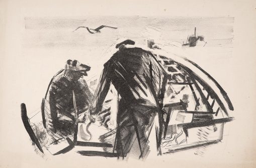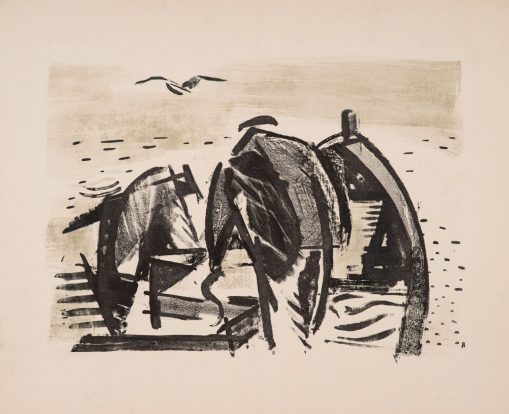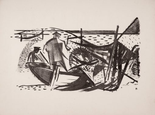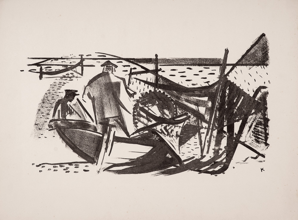 - Hans Kinder, Fischer mit Netzen, 1960er Jahre, Lithografie auf Papier, 45 x 60 cm