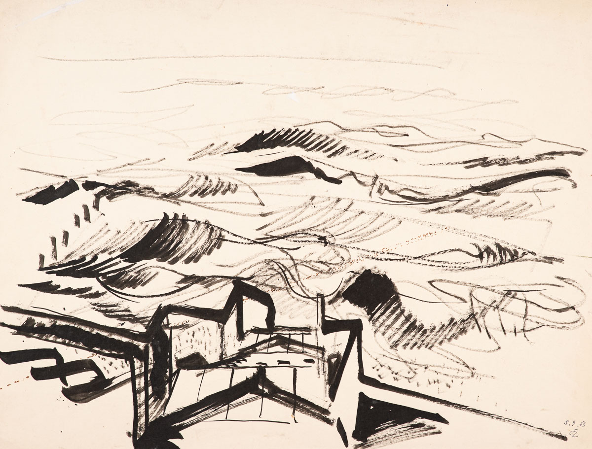 - Hans Kinder, Bei Wehlen, Sächsische Schweiz, o. J., Tusche auf Papier, 51 x 38,5 cm