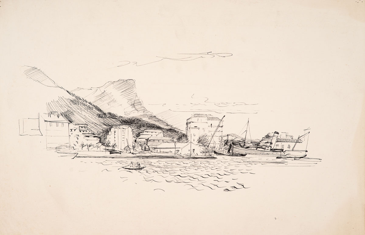 - Hans Kinder, Hafen Marseille, o. J., Federzeichnung auf Papier, 38 x 55 cm