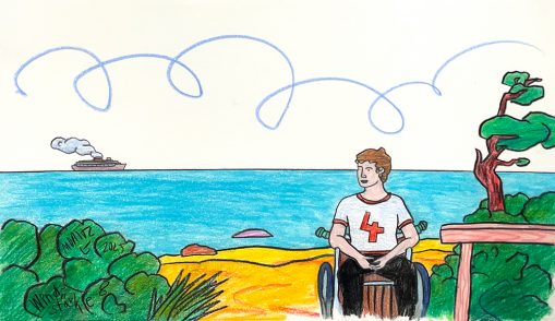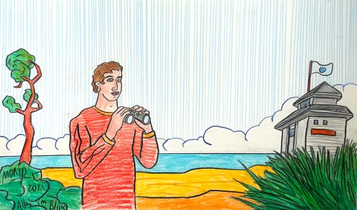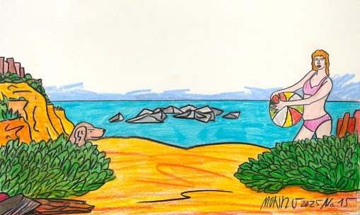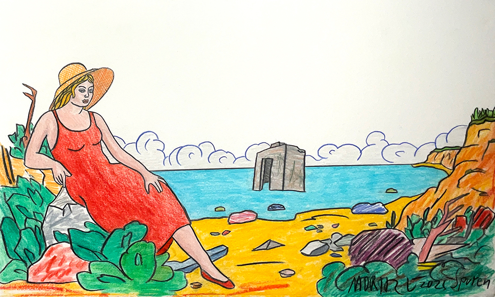 - Moritz Götze, „Allein am Strand“, Originalentwurf zu „Strandübergang 13“, 2025, Farbstift auf Papier, 24 x 40 cm
