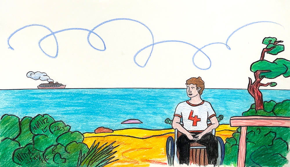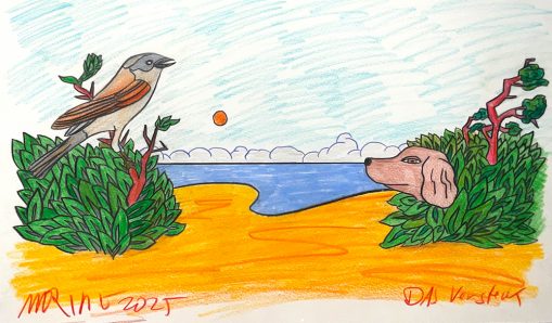 - Moritz Götze, „Alles im Blick“, Originalentwurf zu „Strandübergang 12“, 2025, Farbstift auf Papier, 24 x 40 cm