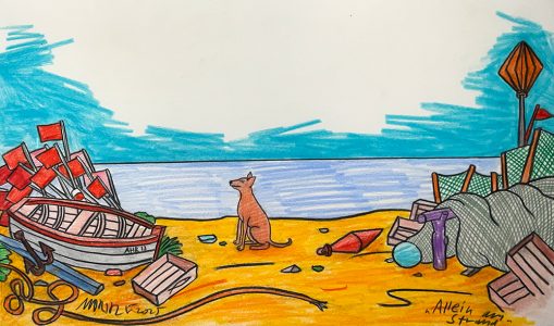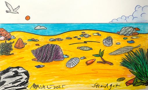 - Moritz Götze, „Strandgut“, Originalentwurf zu „Strandübergang 6“, 2025, Farbstift auf Papier, 24 x 40 cm